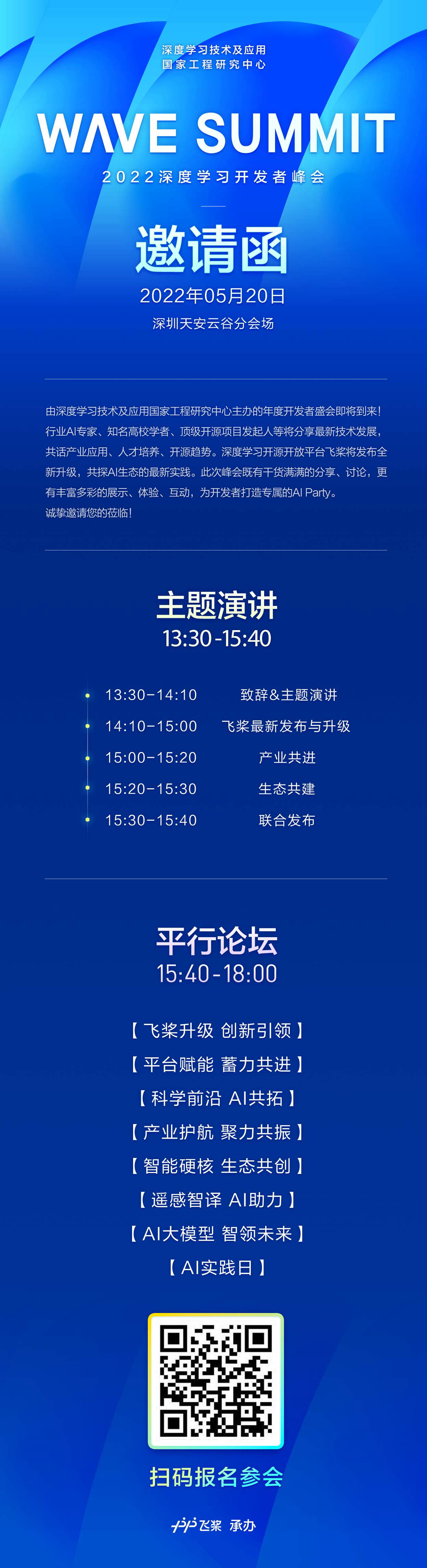 行业AI专家、知名高校学者、顶级开源项目发起人等将分享最新技术发展,共话产业应用、人才培养、开源趋势。深度学习开源开放平台飞桨将发布全新升级,共探AI生态的最新实践。此次峰会既有干货满满的分享、讨论,更有丰富多彩的展示、体验、互动,为开发者打造专属的Al Party。诚挚邀请您的莅临!